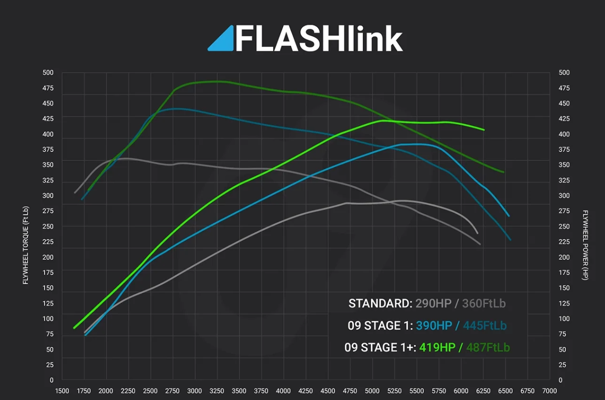 Developed entirely in-house by 09Design’s calibration engineers, this upgrade consists of two additional performance calibrations that transform your vehicle’s performance from the factory 290bhp / 360FtLb to an impressive 390bhp / 445FtLb when running our Stage 01 calibration and 419bhp / 487FtLb when running our Stage 01+.
